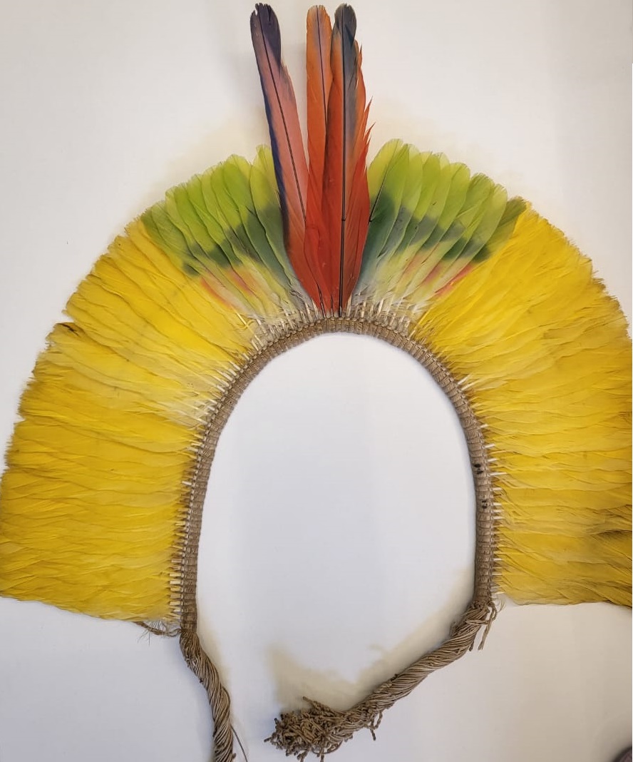 Imagem de cocar de Daiara Tukano, constituído por penas amarelas nas extremidades e penas verdes na região mais central, ao centro do cocar, encontram-se 03 penas vemelhas, que são maiores do que as outras. Este cocar esteve em formato material no espaço expositivo.