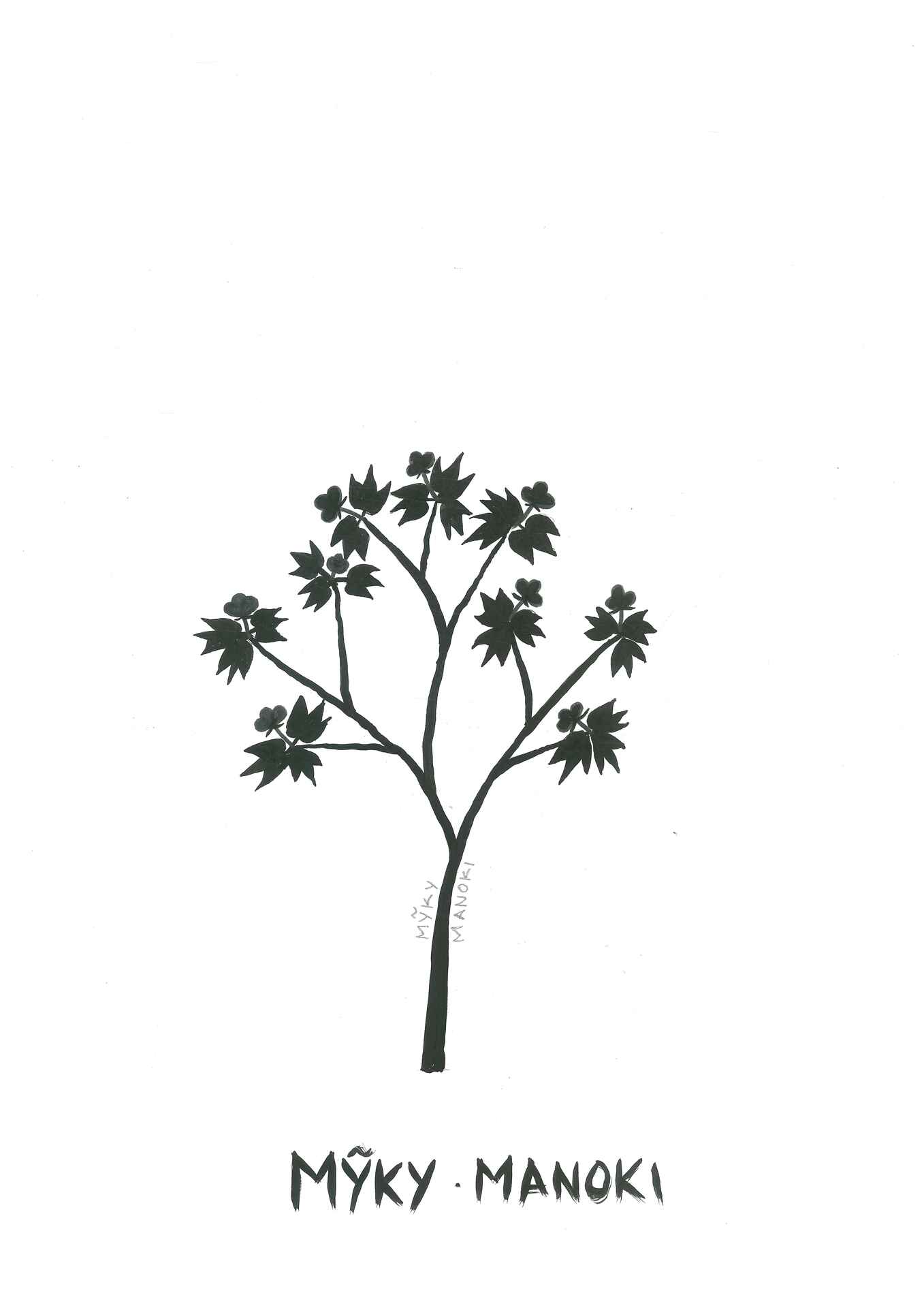 Desenho de árvore intitulada: Mỹki-Manoki, pela artista visual Daiara Tukano, que acompanha a descrição: suave como o algodão. O desenho conta com um tronco e nove galhos floridos, na cor preta e está disposto sob um fundo branco.