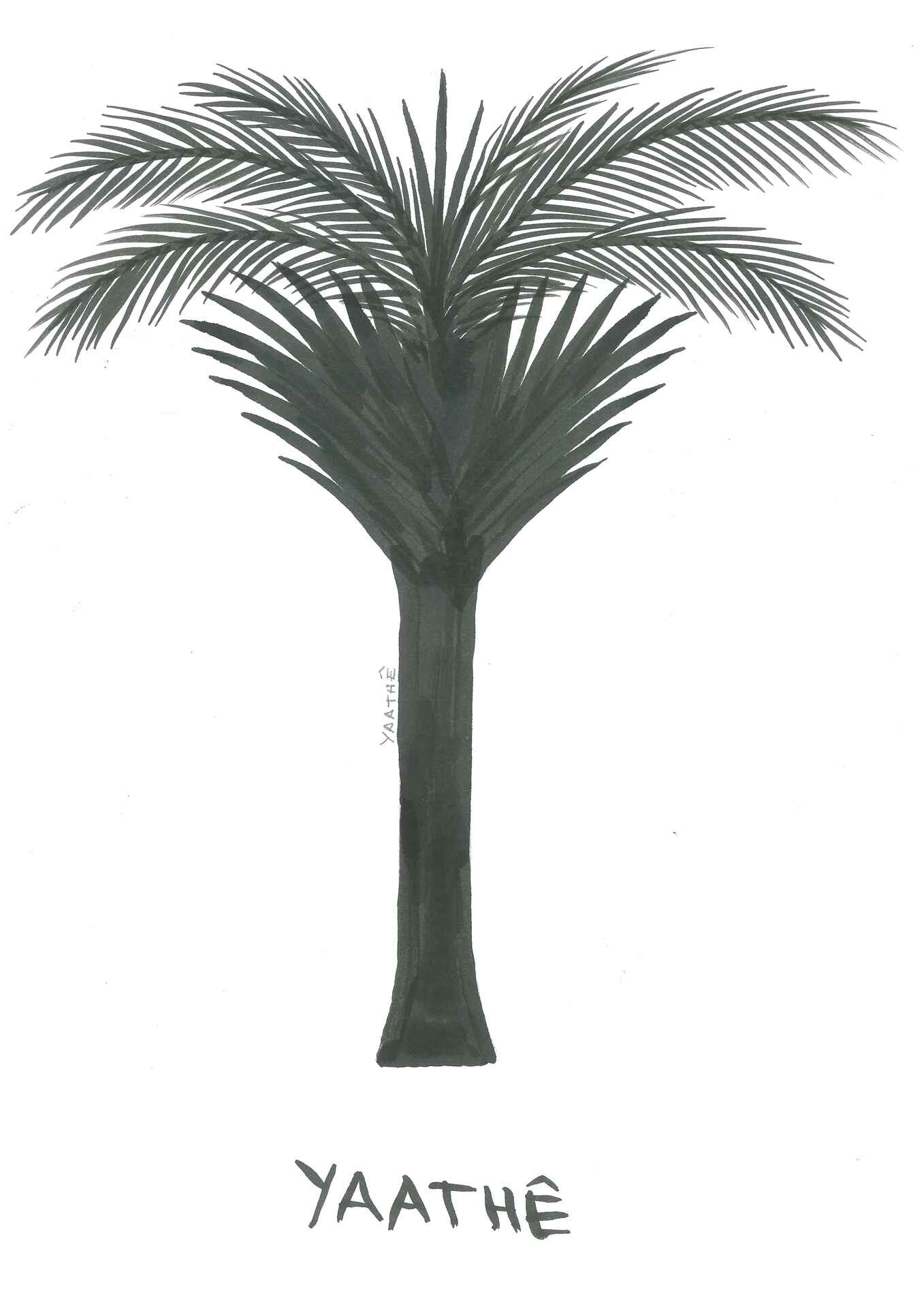 A ilustração em fundo branco. No centro, há uma representação de uma palmeira com tronco reto e alongado, de cor escura. Na parte superior, as folhas se abrem em formato de leque, formando uma copa densa com várias folhas longas e finas, também escuras. Próximo ao tronco, está escrito em letras pequenas a palavra “YAATHÊ”