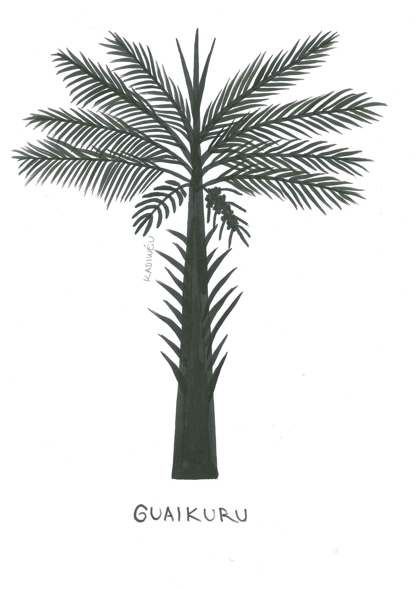 A imagem apresenta uma ilustração de uma palmeira com tronco reto e folhas longas e finas, dispostas em forma de leque na parte superior. Há também um pequeno cacho pendente próximo ao topo. Ao lado da planta, está escrito Kadiwéu em letras pequenas, e abaixo da ilustração, em letras maiúsculas, aparece a palavra GUAIKURU.