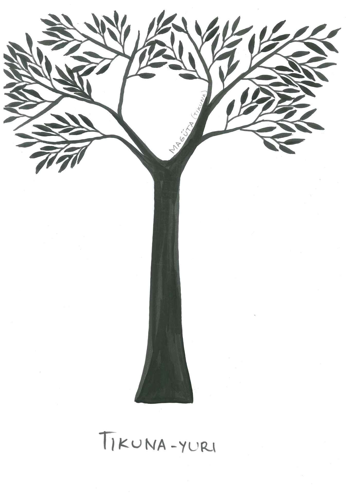 A imagem mostra uma ilustração de uma árvore com tronco reto e espesso, que se ramifica no topo formando uma copa ampla com muitos galhos e folhas pequenas. Ao lado do tronco, está escrito Magüta/Tikuna em letras pequenas, e abaixo da ilustração, em letras maiúsculas, aparece a palavra TIKUNA-YURI.