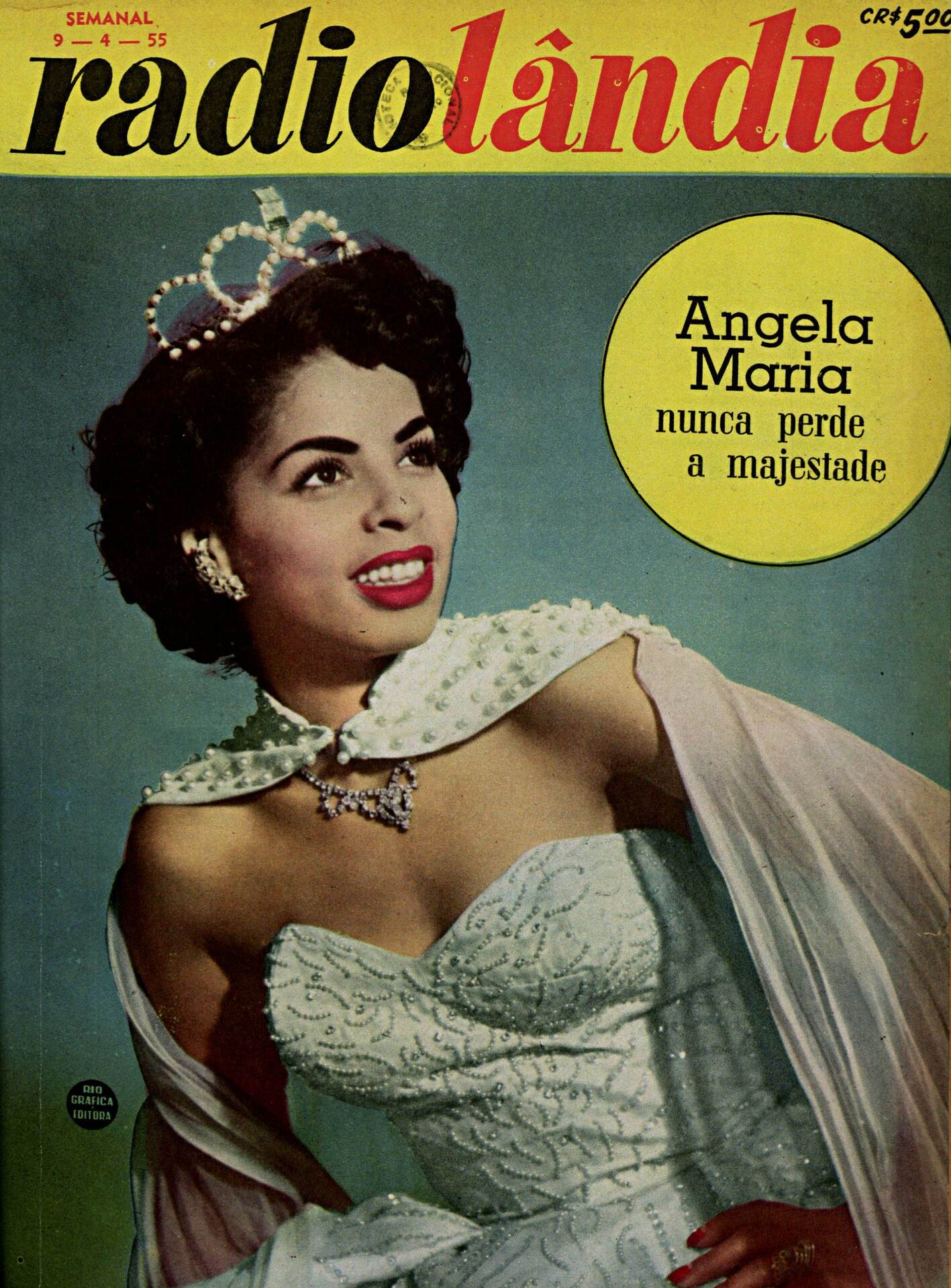 Capa da revista Radiolândia com a cantora Angela Maria com o subtítulo "nunca perde a majestade". Nessa foto a cantora está usando um vestido tomara que caia da cor branca, com uma capa da mesma cor e uma coroa de brilhantes.