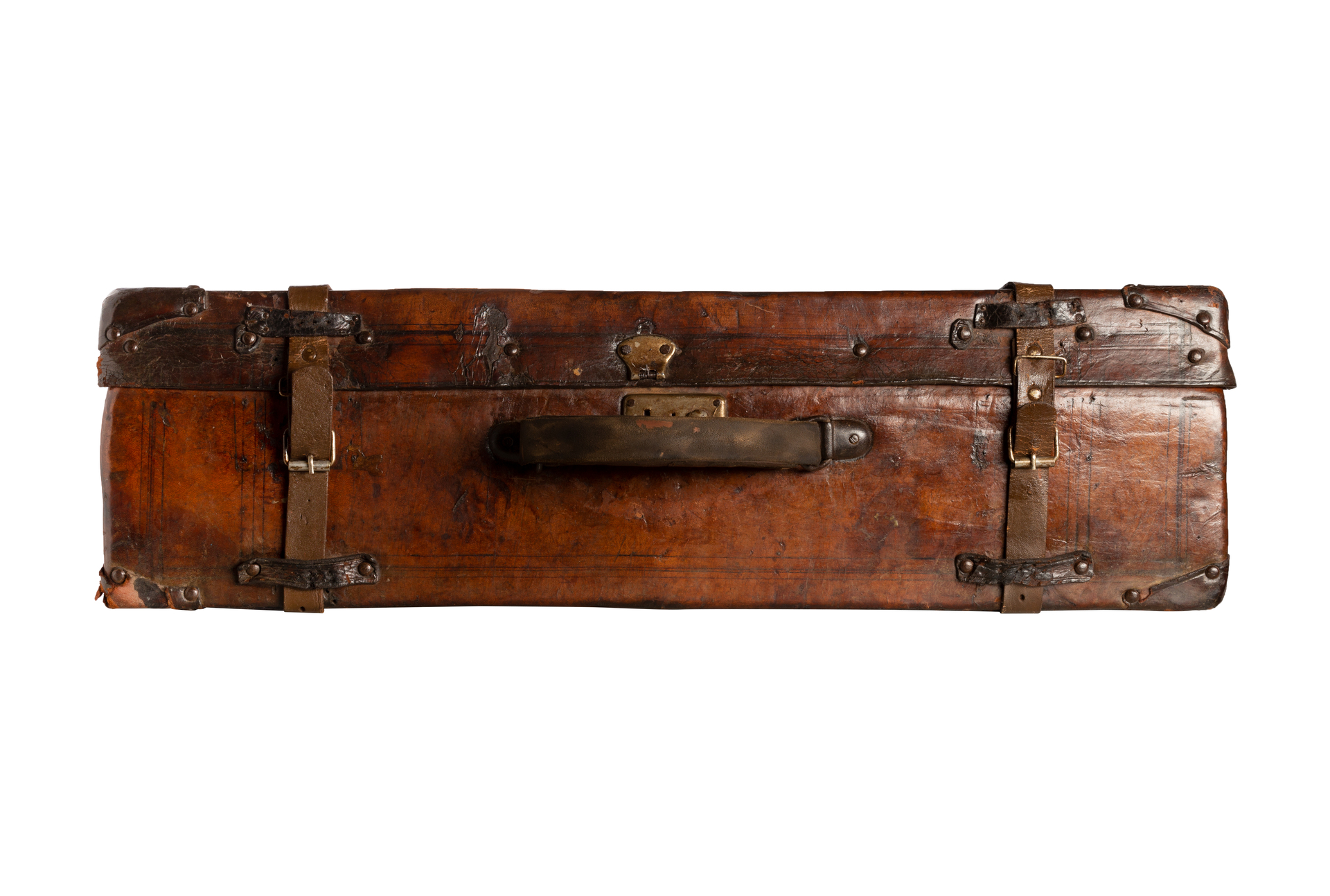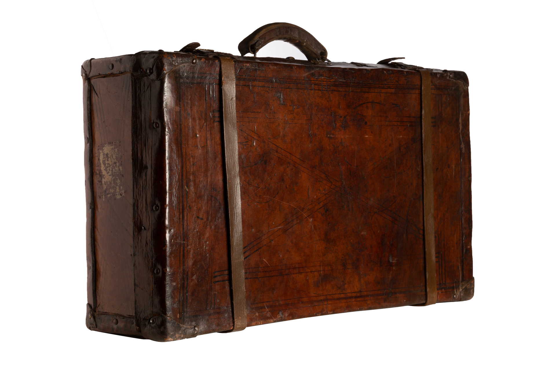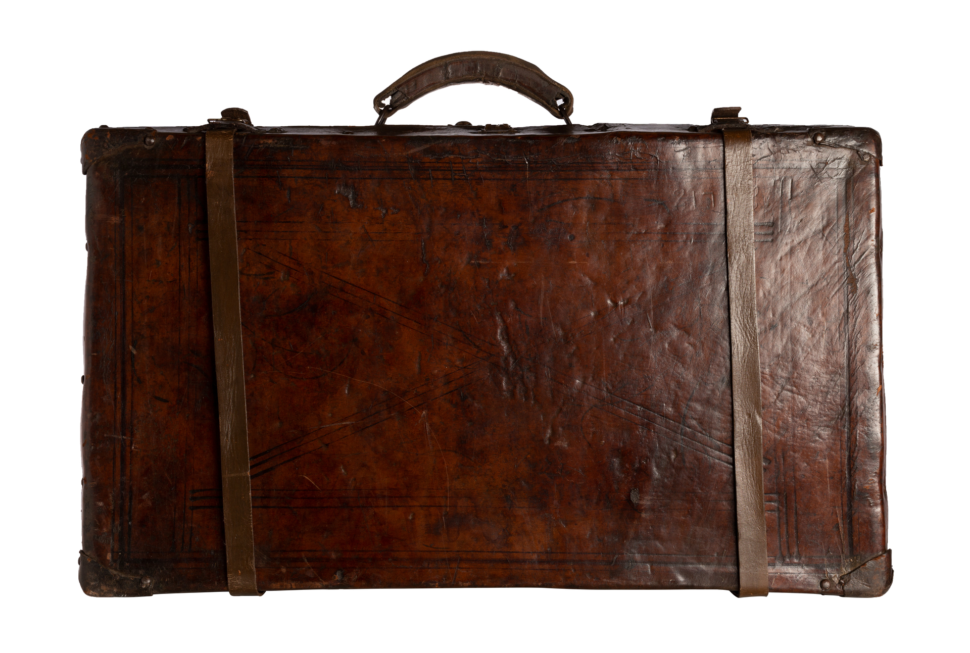 Mala retangular confeccionada em madeira revestida por couro escuro, com estrutura reforçada por cantoneiras e tiras metálicas. Apresenta alça superior central em couro, rebites aparentes e fechos metálicos. O corpo exibe marcas de uso, manchas e arranhões, com inscrições e gravações lineares simples no couro, formando composições geométricas sutis.
