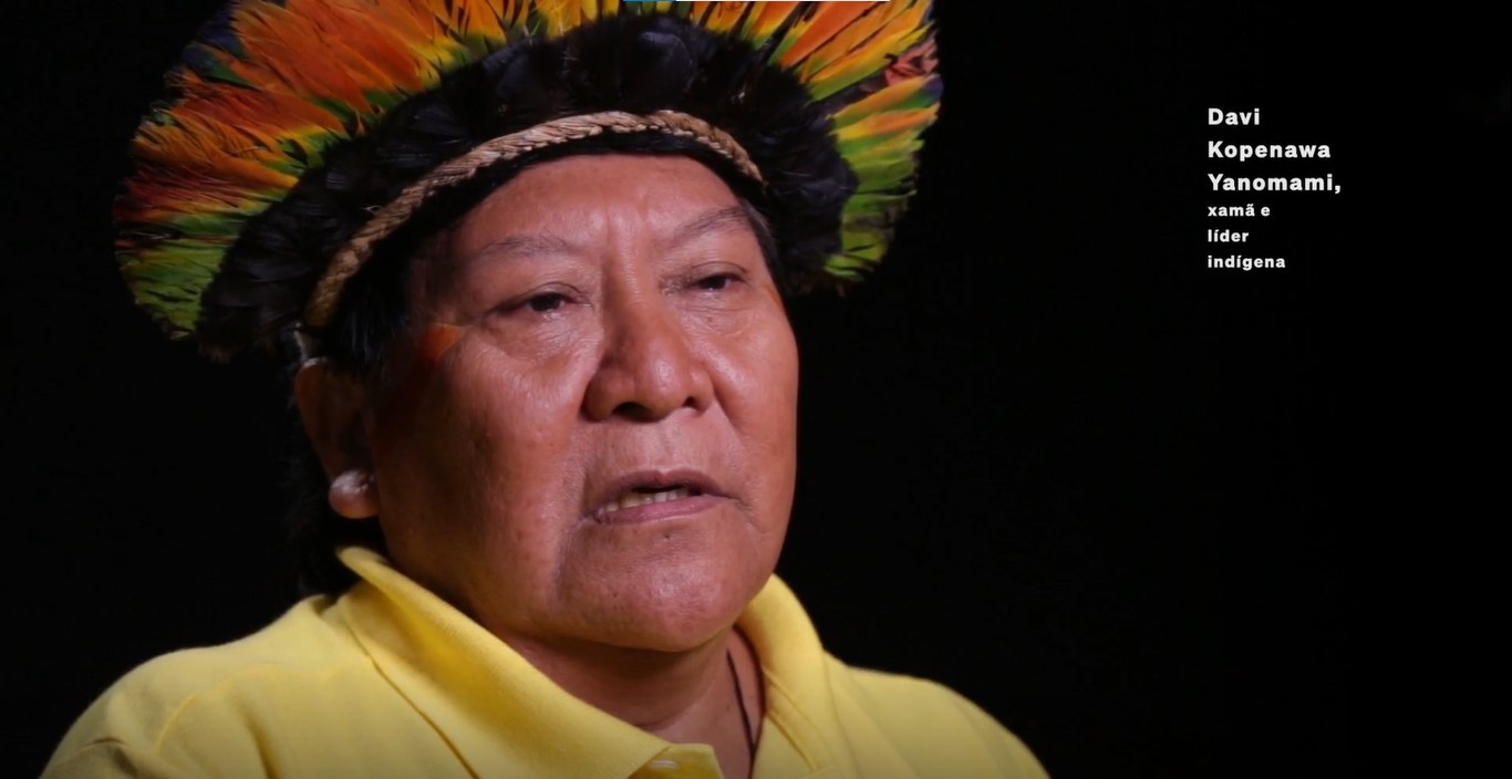 Na nossa floresta Yanomami, não tem papel, caderno, lápis, caneta, borracha, quadro... Nós também não sabemos fazer essas coisas... Nós sabemos falar. Nós falamos, conversamos, fazemos diálogos cerimoniais, xamanismo. [música ao fundo]