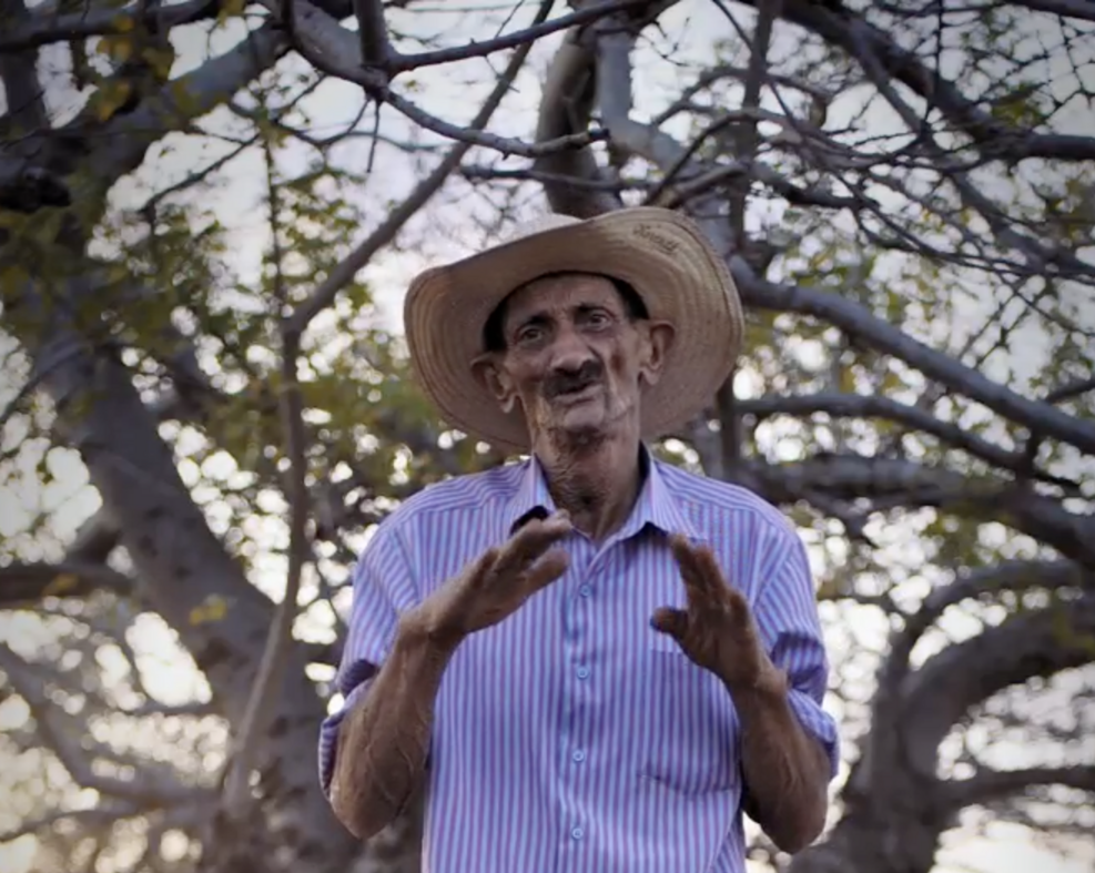 Aqui, eu estava aqui um dia, aqui nesse espaço, e tinha dois senhores sentados, dois senhores, também da roça, comversando. Aí, um falou pro outro assim: “Olha, esse ano vai chover pouco.” O outro falou: “Ah, mas por quê?” Ele falou assim: “Porque a cagaiteira...” Cagaiteira é uma fruta aqui de uma árvore do serrado, aqui da região nossa. “Porque a cagaiteira deu pouca cagaita. Quando a cagaiteira dá pouca cagaita, vai chover pouco. Quando ela dá muita cagaita, vai chover muito.” Aí o outro senhor falou assim: “Ahh... Cê falou um negócio certo, eu agora fui na “recordânça” e lembrei da fazenda do meu avô, que tinha um pé de cagaita na porta, e que geralmente era assim mesmo.” “Recordança”... Isso é lindo! Partindo de um homem daquele que sabe o nascedouro da língua. [som de galinhas ao fundo]
