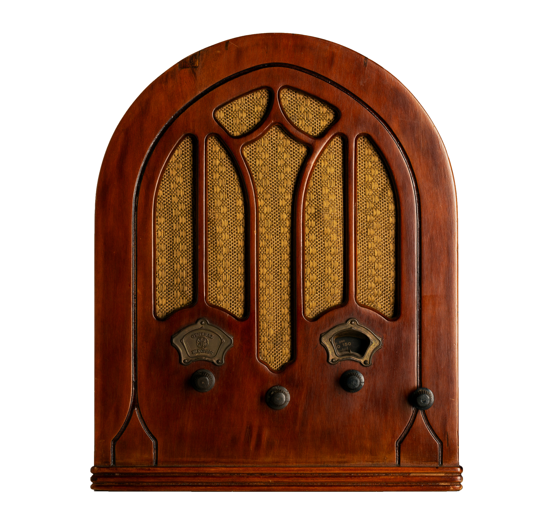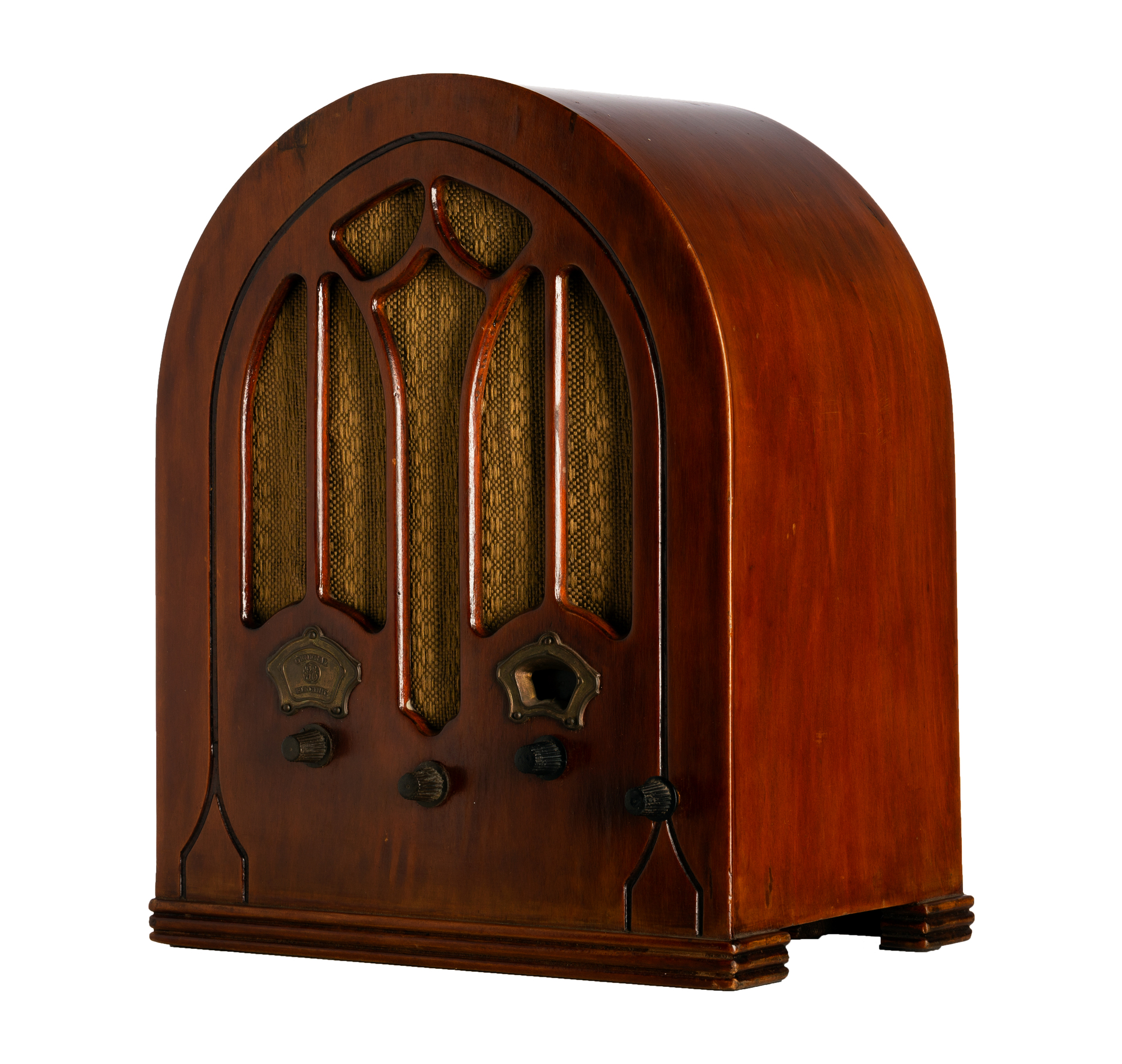 Rádio de mesa com corpo em madeira envernizada e formato de arco ogival, conhecido como cathedral. A parte frontal possui tela de tecido trançado de tom amarelado, protegendo o alto-falante. Abaixo, há três botões de controle em baquelite e duas pequenas janelas de mostradores metálicos para sintonia e volume.