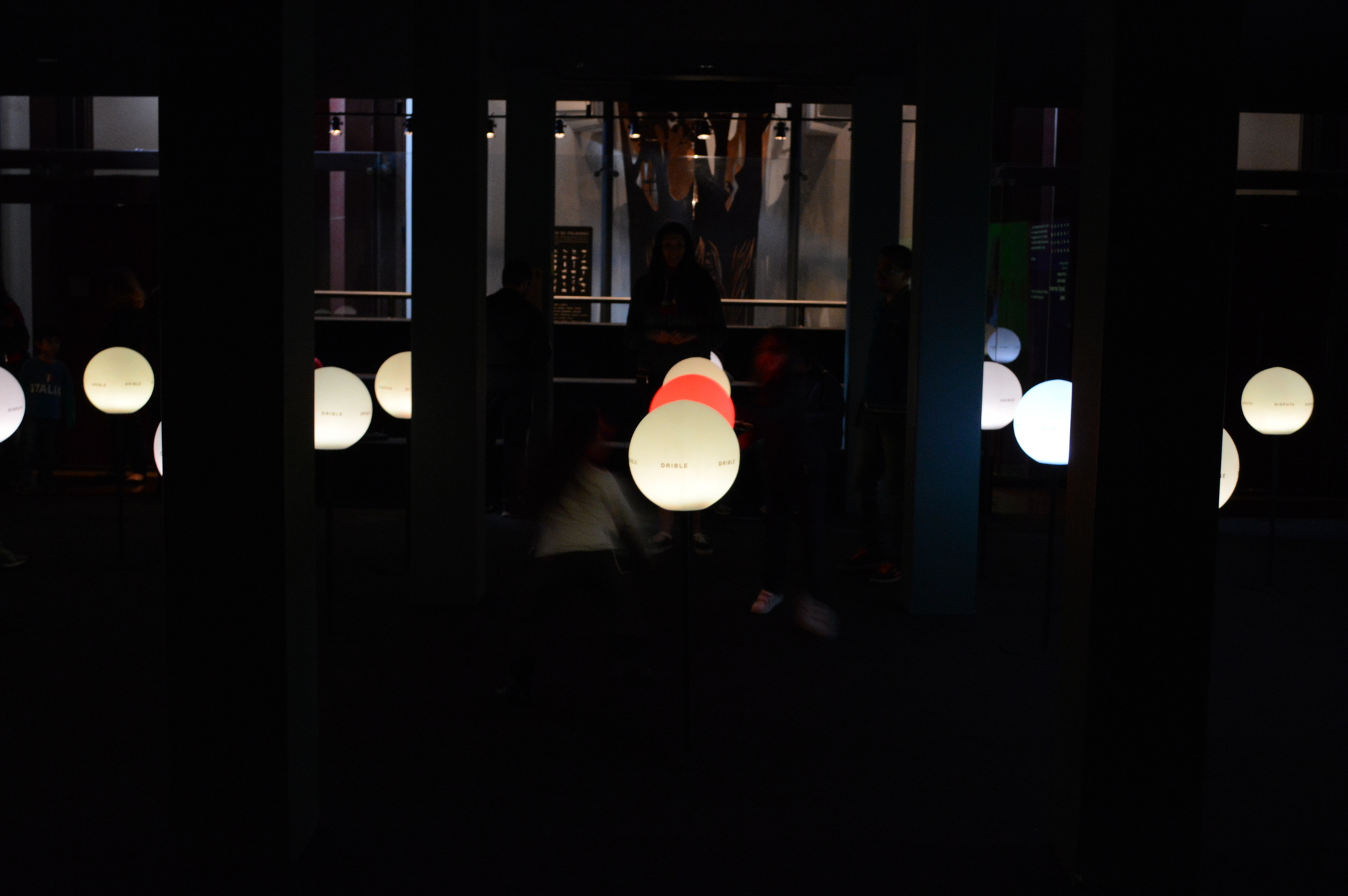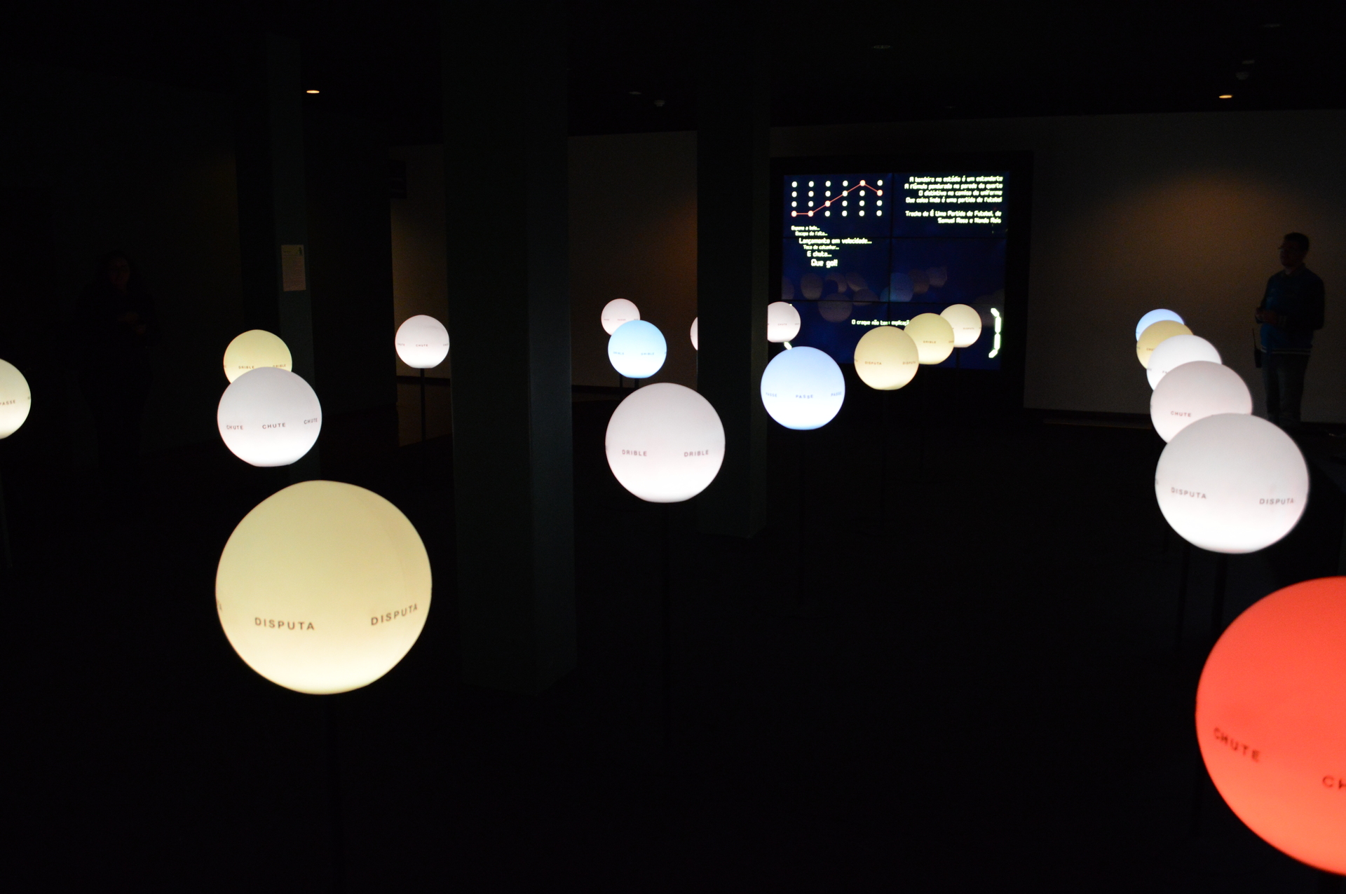 Um segundo ambiente expandia a experiência com foco nas sonoridades da língua portuguesa. Nele, as esferas se transformavam em cúpulas sonoras suspensas, distribuindo frases, poemas e músicas relacionadas ao tema. A ambientação incluía também duas TVs de 60 polegadas: uma exibia textos literários mais longos e a outra apresentava uma mesma jogada histórica — o gol de Carlos Alberto na Copa de 1970 — narrada por locutores de diferentes regiões do Brasil e também de Portugal, destacando sotaques, ritmos, jargões e estilos narrativos diversos. Arquibancadas adicionais completavam o espaço, permitindo ao público folhear jornais educativos especialmente produzidos para a exposição.