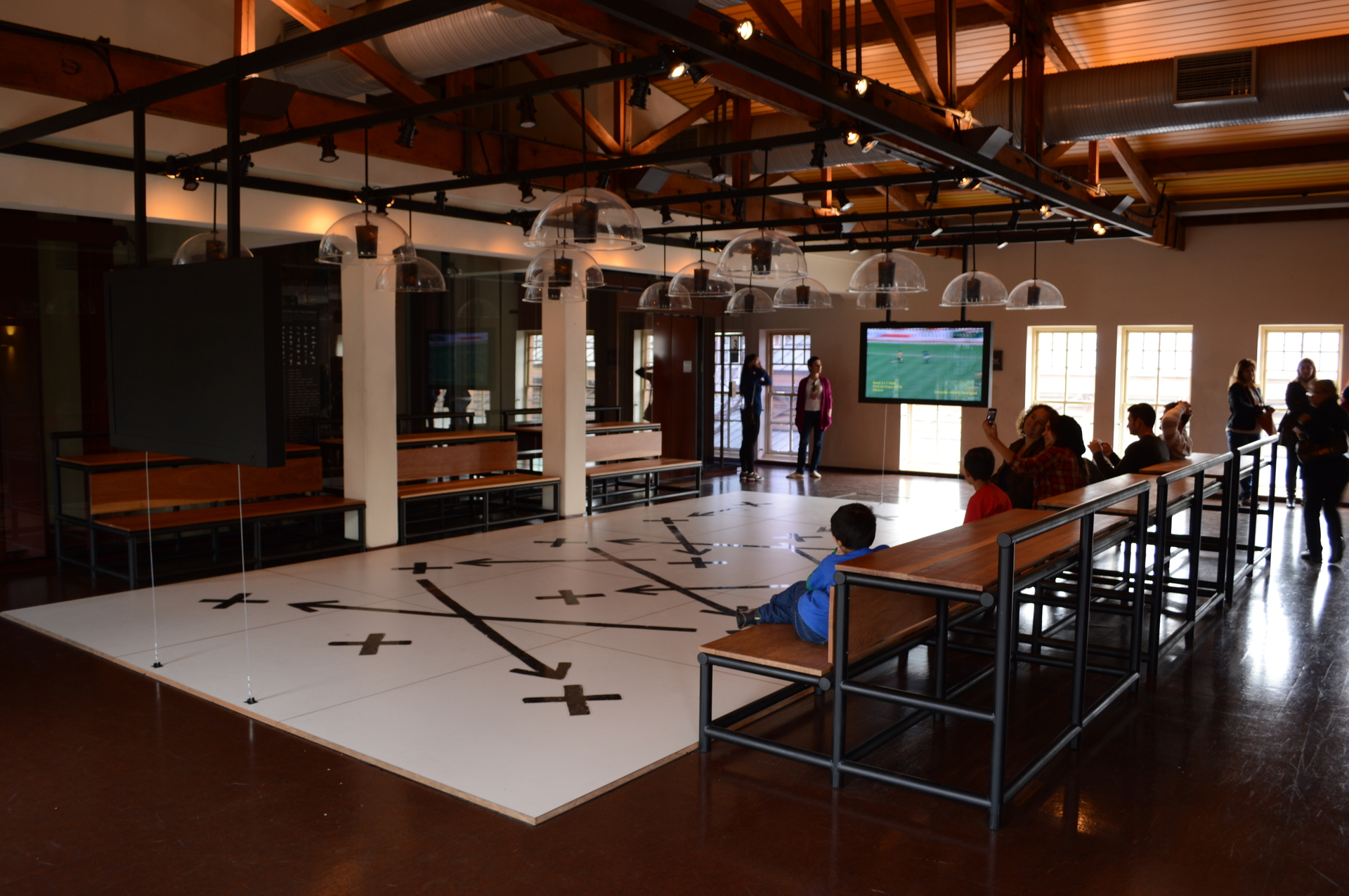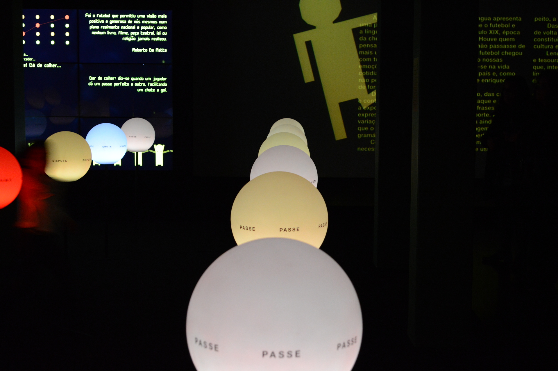 Cenograficamente, a exposição foi concebida como uma grande instalação, pensada para proporcionar experiências coletivas — ecoando o espírito do próprio futebol. O Ateliê Marko Brajovic desenvolveu a cenografia e a comunicação visual, explorando ideias de esquemas táticos e game-play como forma de integrar os conteúdos linguísticos e futebolísticos. A instalação principal remetia a um campo de futebol com duas grandes telas de vídeo-wall nos gols e 24 esferas luminosas suspensas representando os jogadores. O visitante podia acionar diferentes movimentos básicos — chute, drible, passe e disputa — que, combinados, geravam 107 jogadas apresentadas nas telas junto aos textos explicativos. Uma arquibancada permitia que os visitantes assistissem às jogadas uns dos outros, e nela estavam também sete tablets com um “dicionário” de futebol repleto de termos, expressões e frases que fazem parte da língua do esporte.