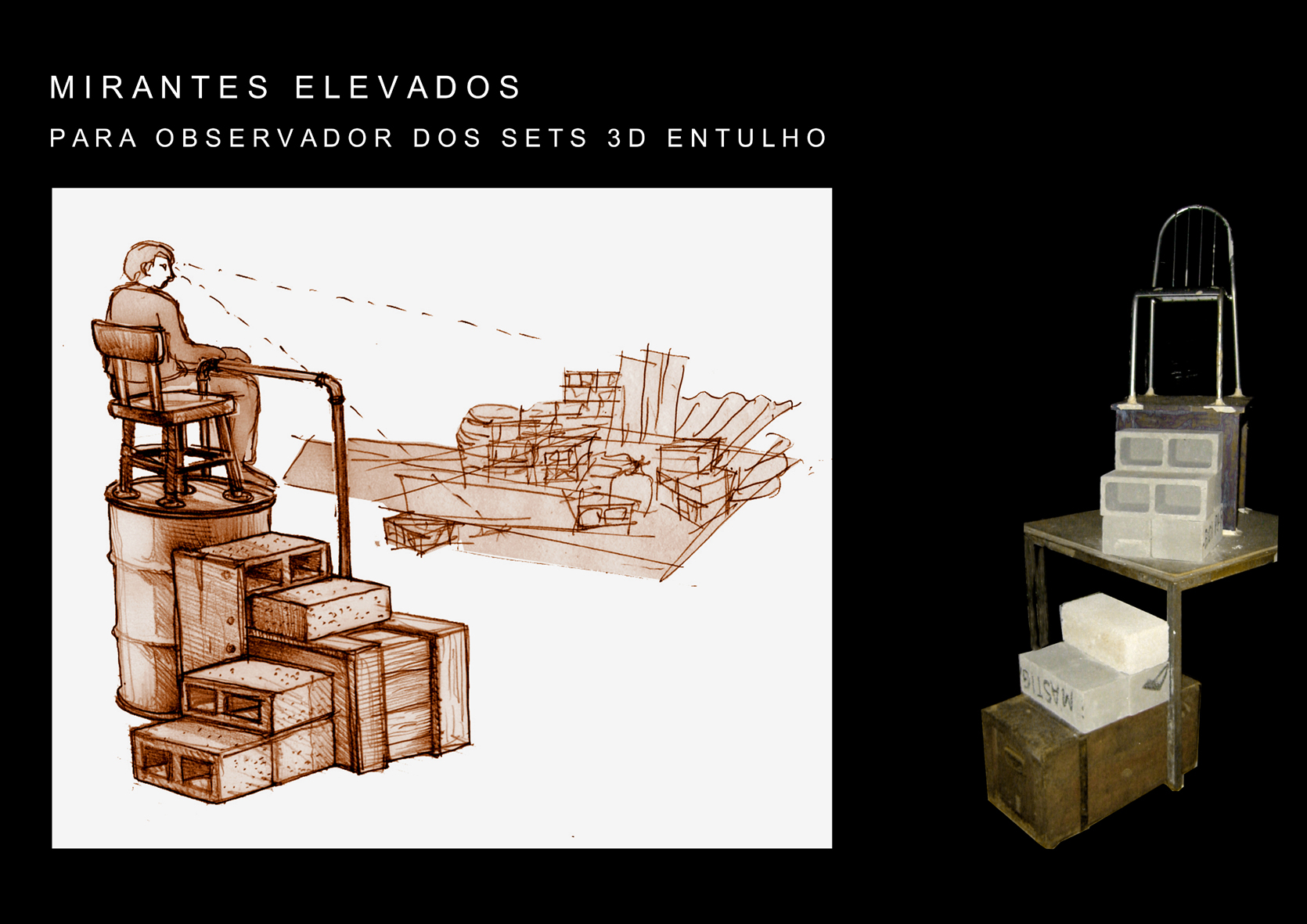 Desenho técnico executivo referente ao Set 3D dos mirantes elevados da área “Interlocutor”, contendo especificações dimensionais, alturas de instalação, pontos de fixação e distanciamento do observador em relação ao conjunto cenográfico de entulhos. O documento integra o projeto expográfico e estabelece parâmetros técnicos para a correta execução, montagem e posicionamento do dispositivo tridimensional no espaço expositivo.