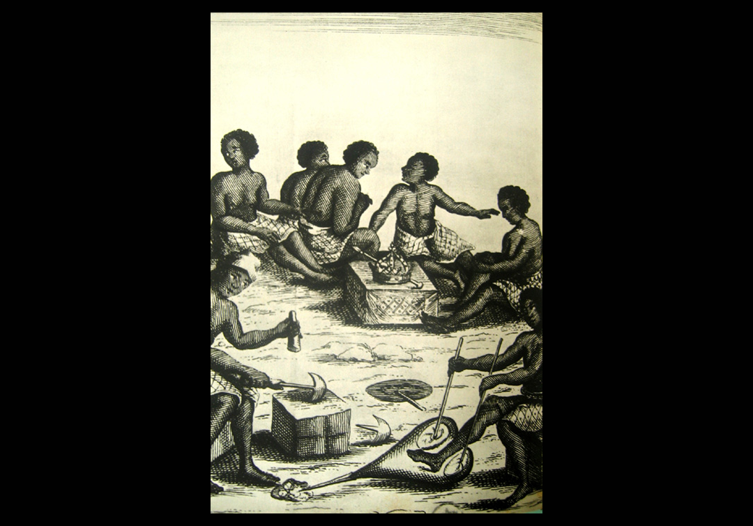 Imagem de gravura de Giovanni Antonio Cavazzi da Montecuccolo que representa uma cena de produção metalúrgica no reino governado pela rainha Nzinga, em Matamba, região correspondente ao atual Kwanza Norte, em Angola.