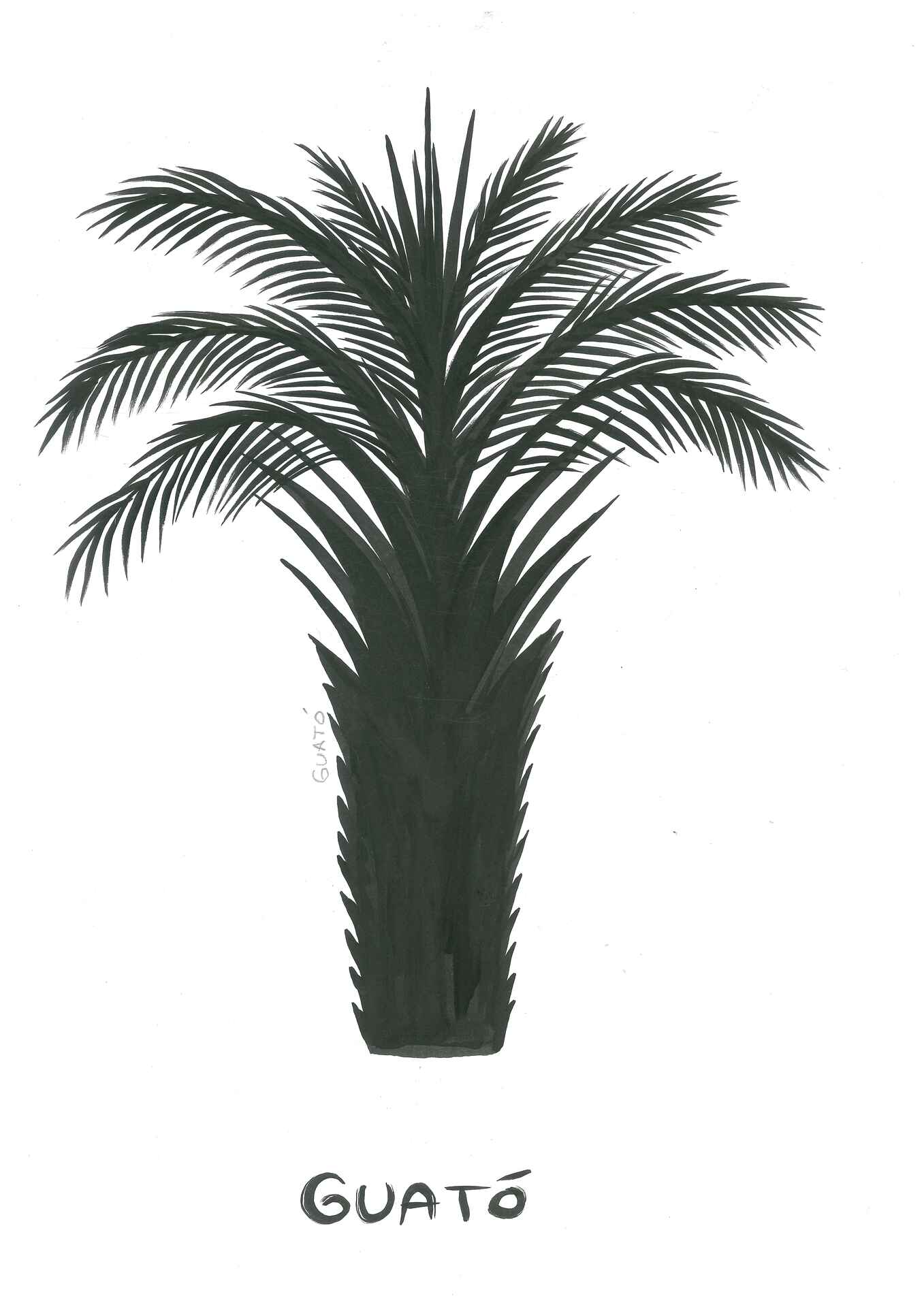 A ilustração é produzida em fundo branco. No centro, há uma palmeira estilizada com tronco reto e escuro, que se alarga levemente na base. A copa é formada por folhas longas e arqueadas, dispostas em várias direções, criando um aspecto volumoso e simétrico. Próximo ao tronco, está escrito em letras pequenas a palavra “Guató”.