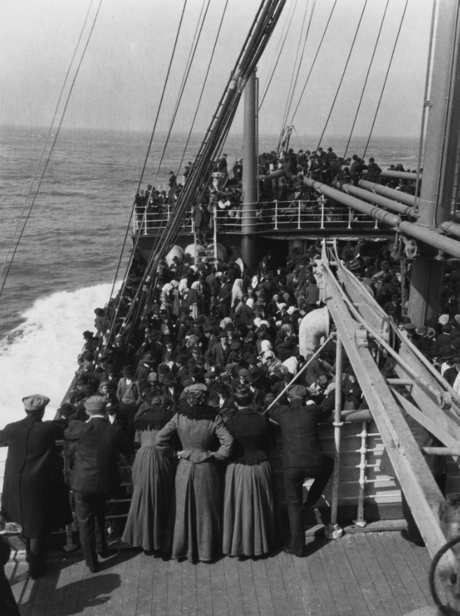 Imigrantes a bordo de um navio, em que se percebe uma maior concentração de pessoas na parte da proa da embarcação, 1905 / Foto de Waldemar Abegg/akg-images