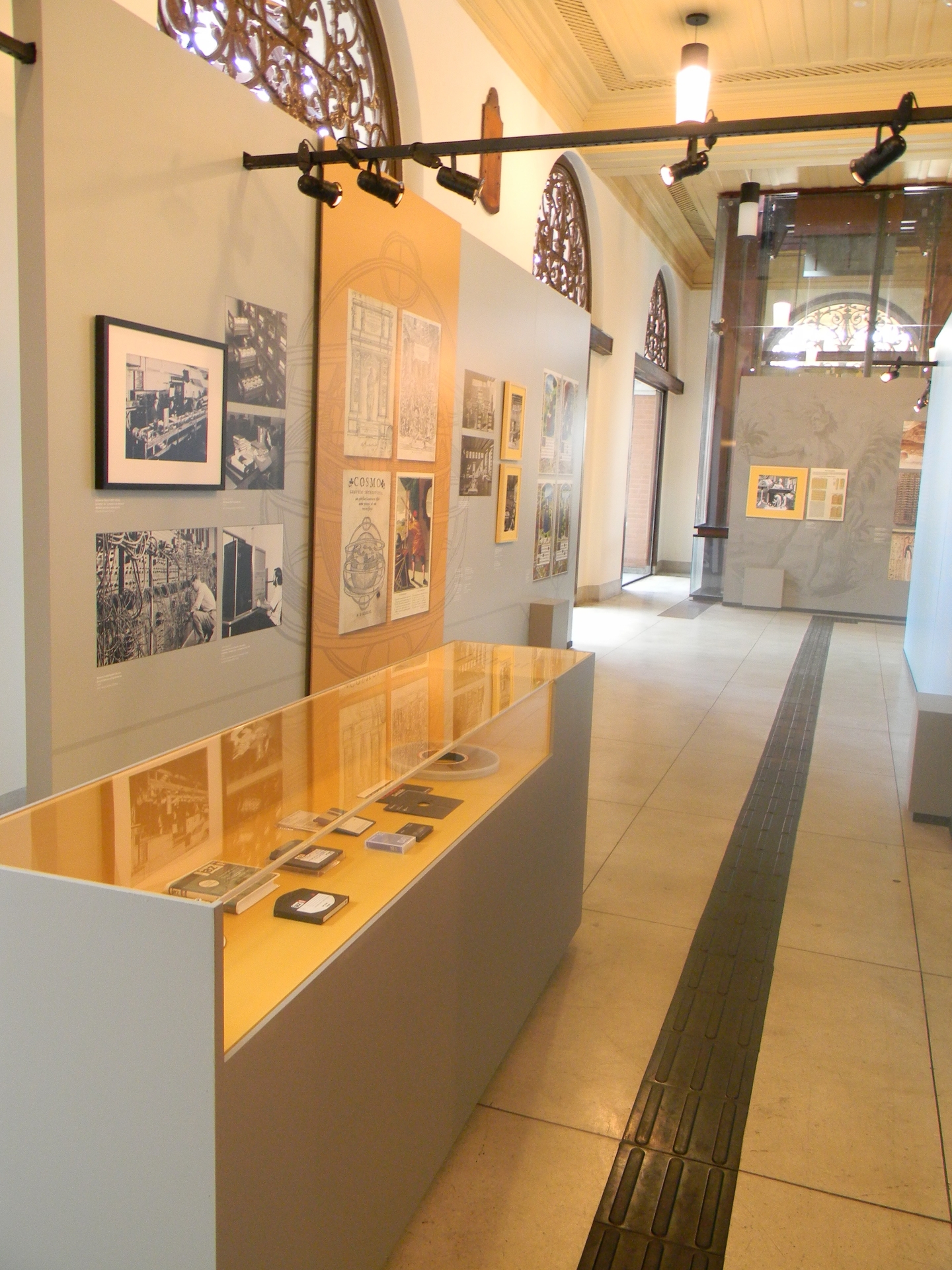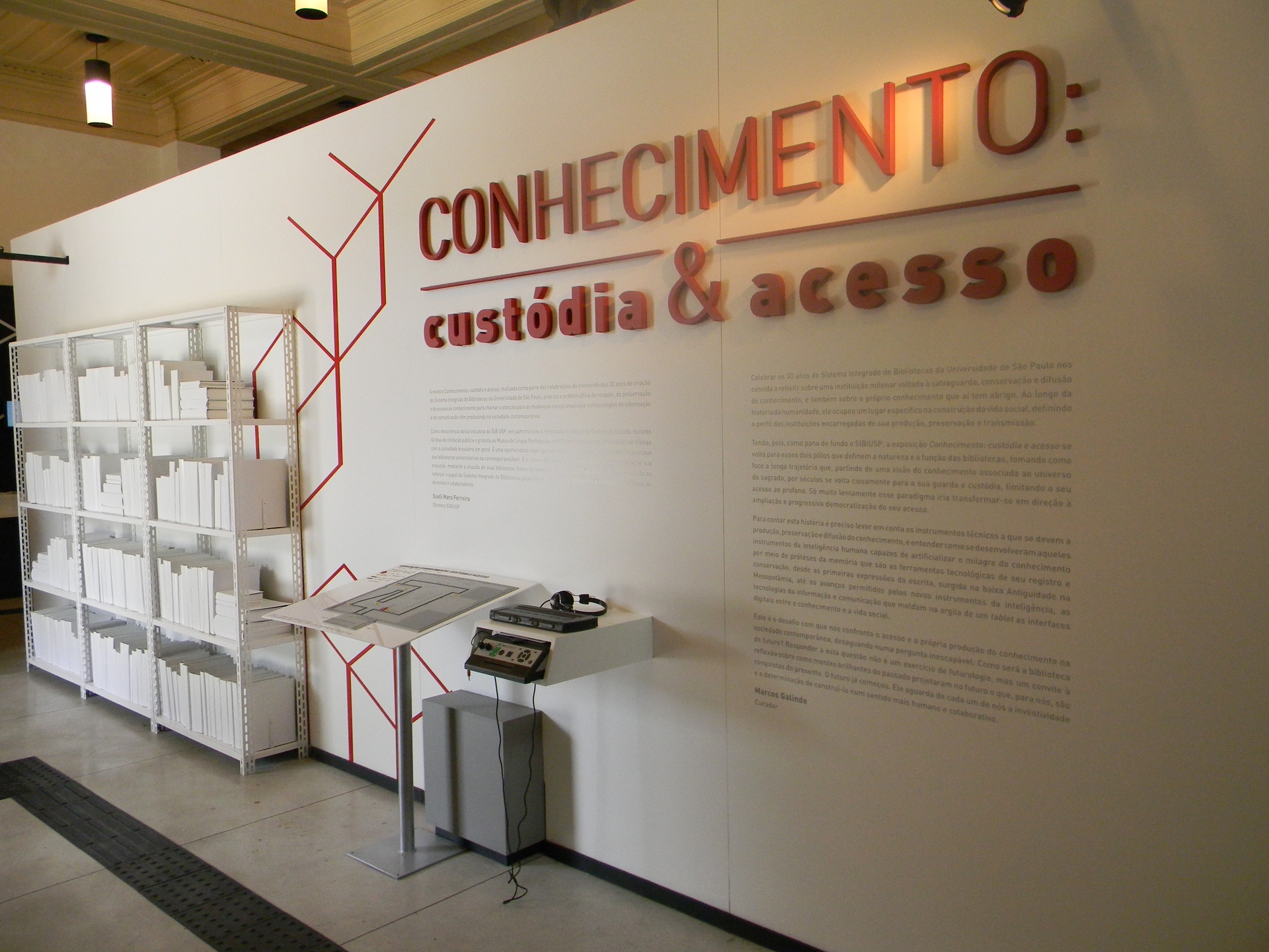 A exposição Conhecimento: custódia e acesso, realizada em comemoração aos 30 anos do Sistema Integrado de Bibliotecas (SIBi) da USP, foi organizada em parceria com o Museu da Língua Portuguesa e apresentou uma reflexão abrangente sobre o papel das bibliotecas na construção e circulação do conhecimento. A mostra discutiu as transformações tecnológicas que, ao longo dos séculos, ampliaram o acesso à informação, desde o surgimento da escrita até a disponibilização de obras na internet. Sob direção da professora Sueli Mara Ferreira, a exposição utilizou São Paulo e sua universidade como pano de fundo para abordar não apenas o funcionamento do SIBi, mas também a trajetória da custódia do conhecimento de forma ampla e simbólica. O percurso partia de Gênesis, como metáfora da consciência da informação, passando pelas escritas rupestres, pelos monges copistas da Idade Média e pela impressão de livros em larga escala, até chegar ao universo digital contemporâneo. A mostra buscou sintetizar diferentes formas de discutir o trinômio conhecimento, custódia e acesso, propondo uma imersão profunda tanto no universo das bibliotecas quanto nas tecnologias e inovações que transformaram os suportes e registros do saber em intervalos de tempo cada vez menores e com impactos mais abrangentes. Dividida em três módulos, a expografia integrou instalações multimídia, vídeos sobre digitalização, plotagens e imagens de obras raras, além de estações para o manuseio de livros eletrônicos, vitrines com objetos e suportes diversos, depoimentos de ex-alunos da USP e computadores com telas touch screen que permitiam acessar mais de quatro milhões de itens impressos e digitais disponíveis nas bibliotecas da USP. Comprometida com a acessibilidade, a exposição incluiu piso e mapa tátil, computadores adaptados com conteúdo em áudio e Braille e ícones QRCode distribuídos pelo espaço, oferecendo conteúdos complementares e sugestões de pesquisa ao longo da visita.