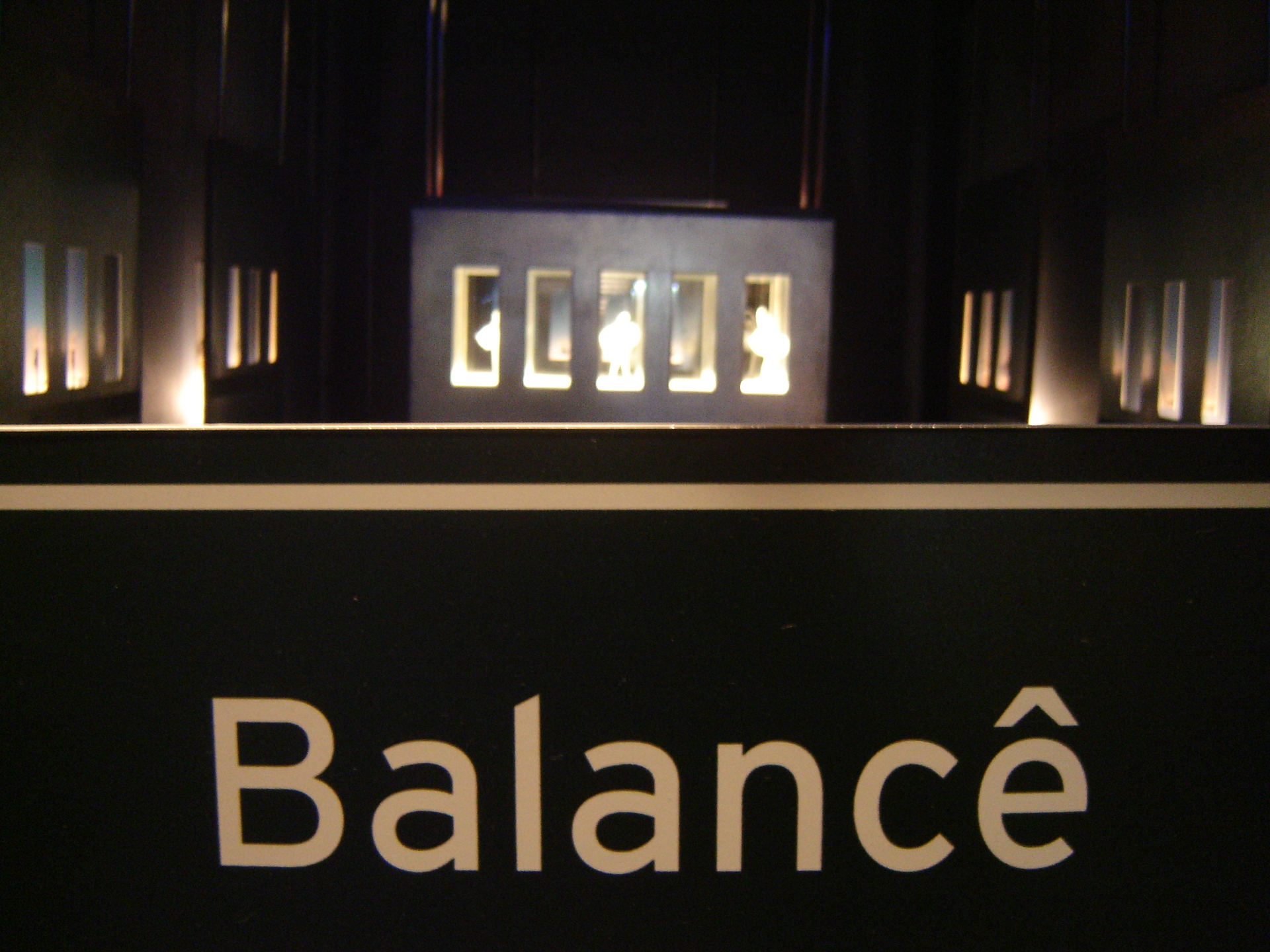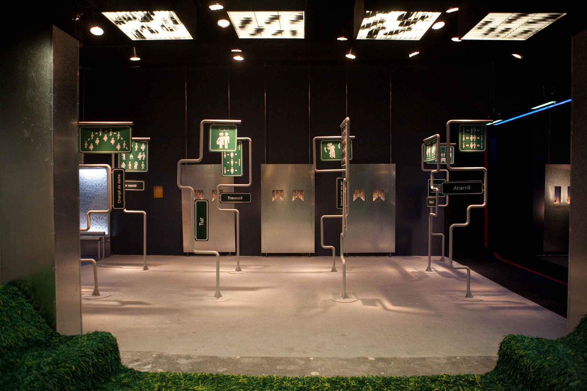 Logo na entrada do primeiro andar, onde ocorrem as exposições temporárias, o público era recebido por uma instalação cenográfica composta por viadutos metálicos e vias iluminadas por LEDs, por onde trafegavam palavras de origem francesa presentes no português. A frase “Em nosso idioma, mais de 5.000 palavras têm origem francesa” introduzia o percurso expositivo.