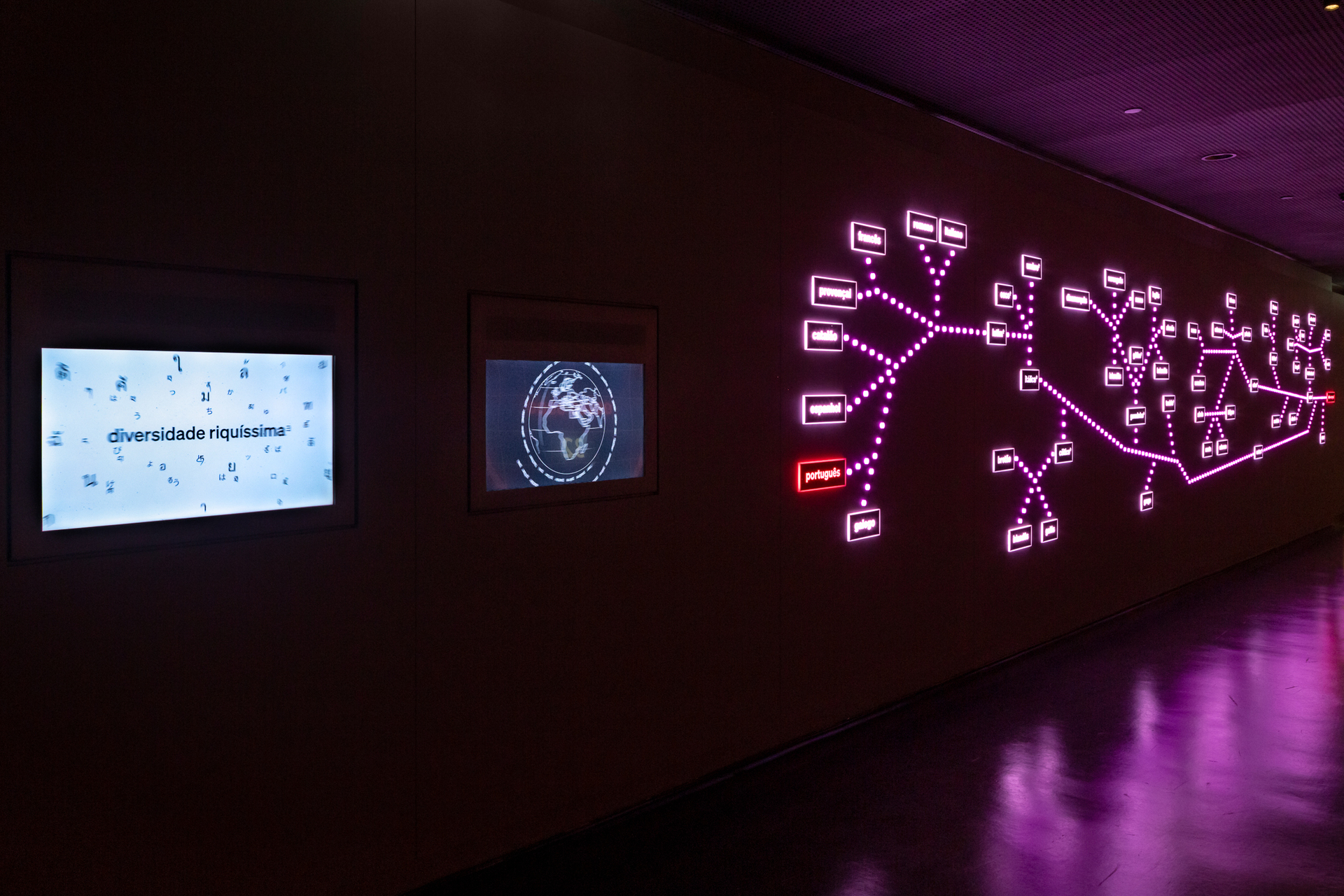 A estruturação da experiência inclui um painel na ala leste do segundo pavimento que apresenta um grande diagrama iluminado e pulsante, mostrando o caminho percorrido pelas línguas. O diagrama cresce e se desenvolve aos olhos do visitante, revelando a relação e o parentesco entre dezenas de grupos linguísticos, destacando as línguas mais conhecidas. A animação é reproduzida em loop. Dois monitores com especialistas complementam as informações com conteúdo em looping. Ao final da instalação, duas telas exibem vídeos que permitem ao visitante se aprofundar no tema.